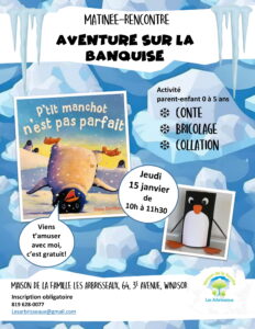 Activité mensuelle parent-enfant (0-5 ans) où on retrouve un conte et un bricolage en rapport avec la thématique suivi d’une collation.