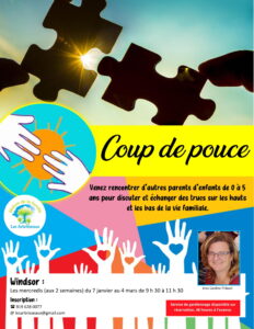 On a tous besoin d’un petit Coup de pouce pour traverser des moments plus difficiles, pour partager les hauts et des bas de la vie familiale ou, tout simplement, pour parler de nos questionnements en tant que parent. Vous êtes les bienvenus avec vos bébés d’un an et moins. Pour les plus vieux, nous offrons un service de gardiennage.