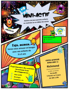 Les CréActifs sont des moments où les parents et leurs enfants (entre 2 et 5 ans) prennent le temps de jouer ensemble. Les deux heures de l’atelier sont remplies d’activités construites autour de différents thèmes pour favoriser le développement des enfants. On ...
